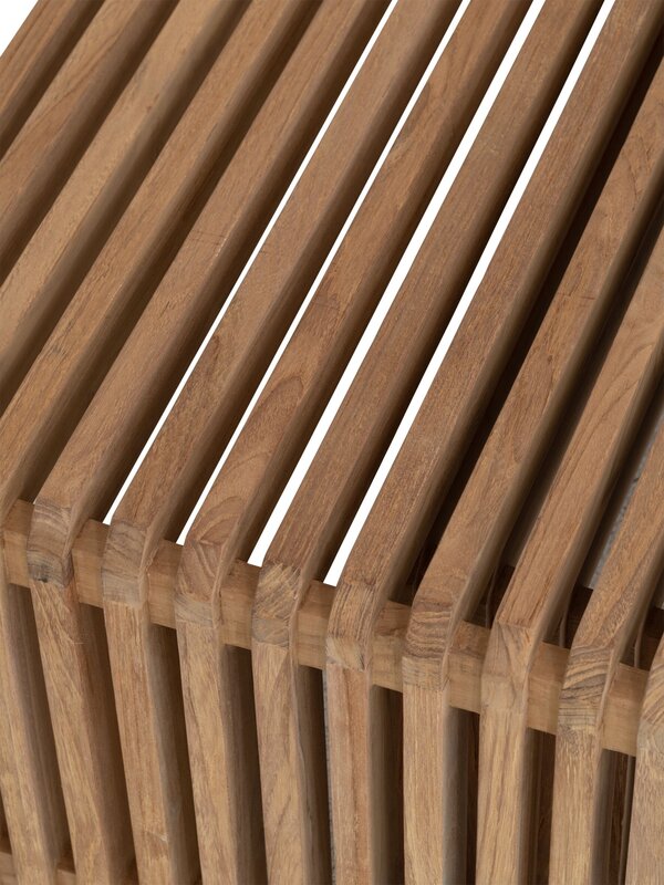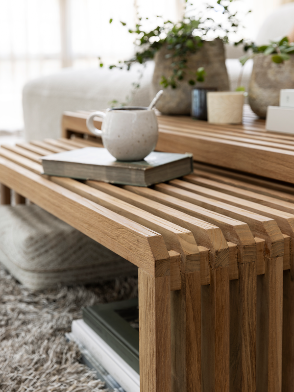 Met de salontafel Steve haal je een stijlvol én praktisch duo in huis. De tafels zijn gemaakt van geborsteld teakhout en hebben een open lattenstructuur die zorgt voor een luchtige uitstraling. Het warme hout brengt direct sfeer in je interieur, terwijl het strakke ontwerp een eigentijdse touch toevoegt.