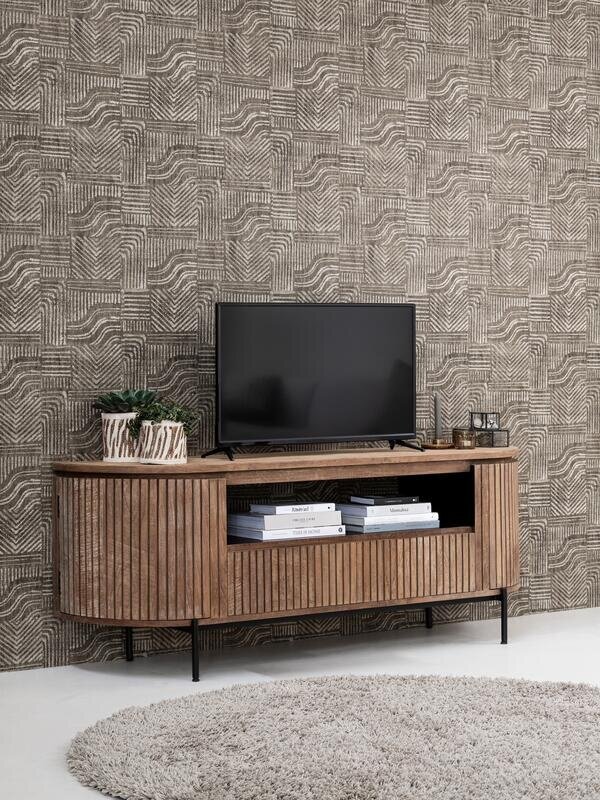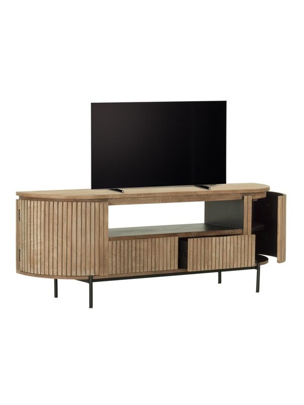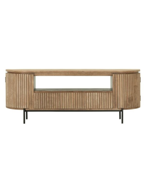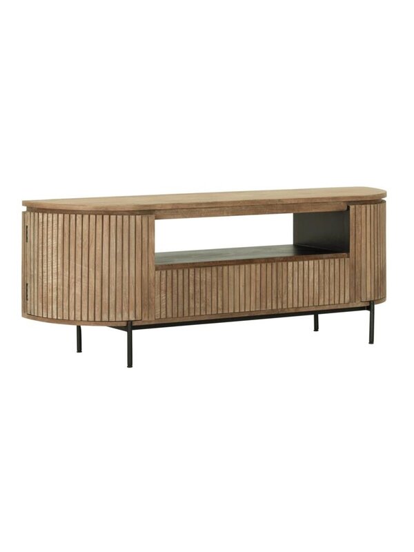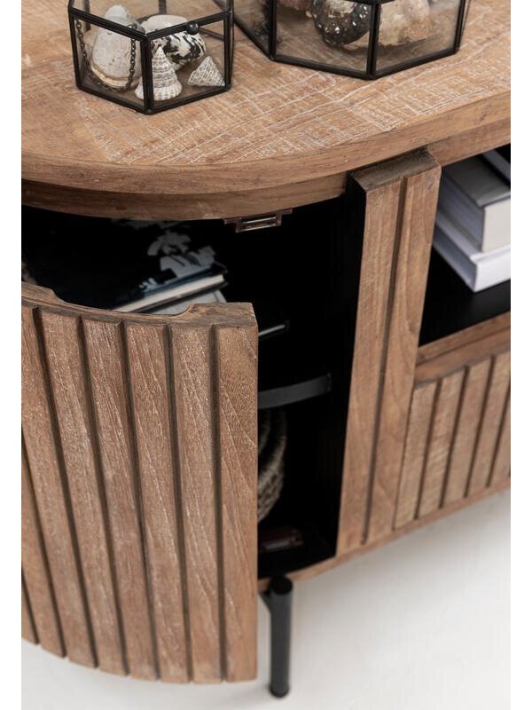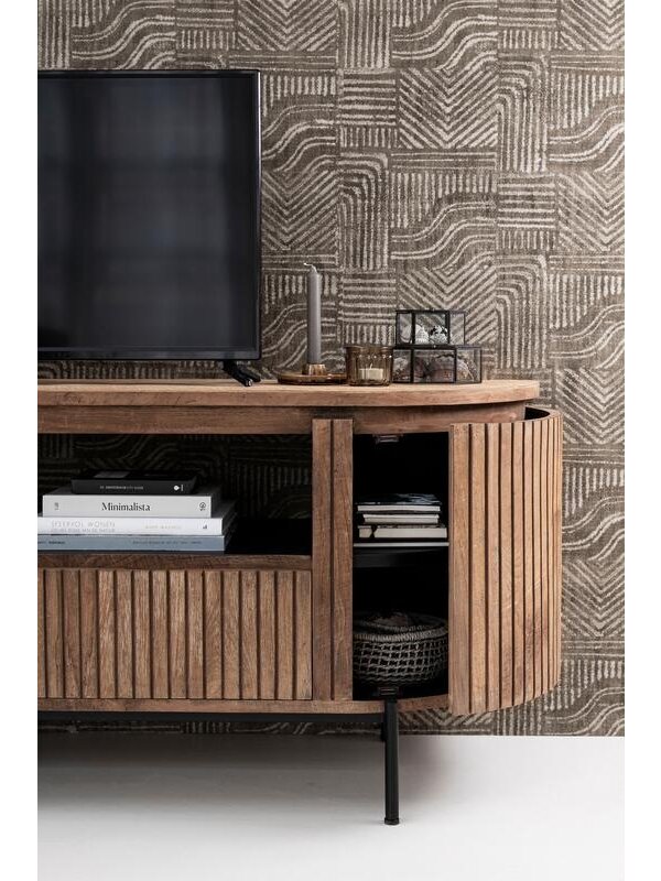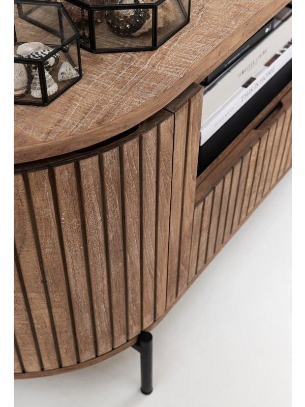 De Banda serie valt op dankzij haar verfijnde details. Het TV-meubel is gemaakt van oud teakhout en wordt gedragen op een rank stalen onderstel. Daarnaast is de kast voorzien van twee deuren en twee lades, waardoor er voldoende opbergruimte is. Banda heeft een unieke uitstraling dankzij de verticale latjes, welke zelfs in de rondingen zijn doorgevoerd. Deze ronde hoekdelen maken Banda zeer uniek in zijn soort.