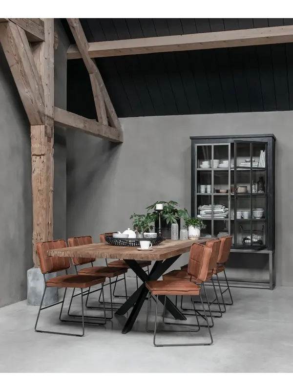 Vitrinekast Blora is gemaakt van oud teakhout en is afgewerkt met een zwarte beits, waardoor de structuur van het hout nog goed zichtbaar is. De grijze stalen deuren en frame staan in mooi contrast met het zwarte hout. Om hem niet te zwaar te maken kun je deze stoere zwarte kast het beste combineren met natuurlijke materialen. De ruimte tussen de planken in de kast is 34 cm.