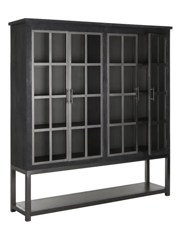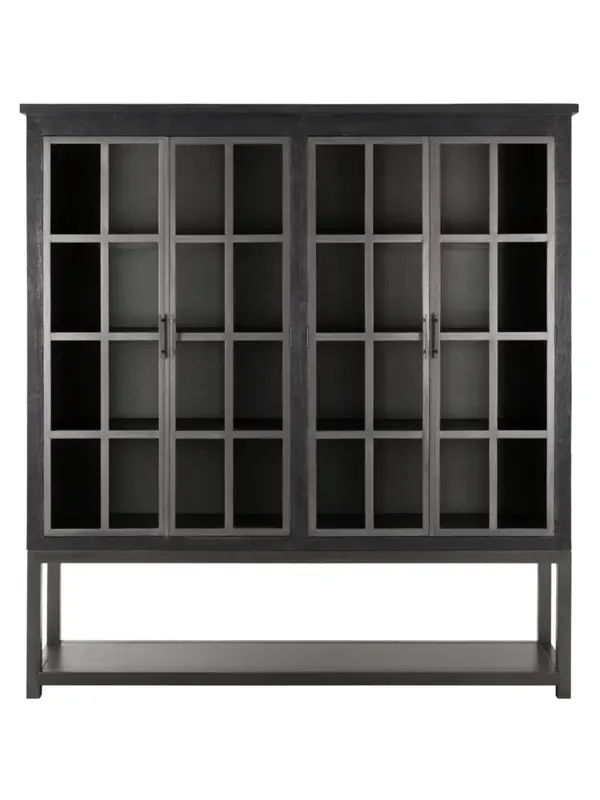 Vitrinekast Blora Black large is gemaakt van oud teakhout en afgewerkt met een zwarte beits, waardoor de structuur van het hout goed zichtbaar is. De grijze stalen deuren en frame zorgen voor een mooi contrast met het zwarte hout. Blora large heeft een extra plank in het frame gekregen, waardoor je ook daar doormiddel van manden extra opbergruimte kan creëren. De ruimte tussen de planken in de kast is 34 cm.