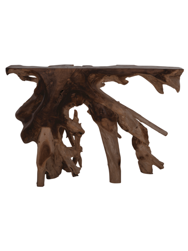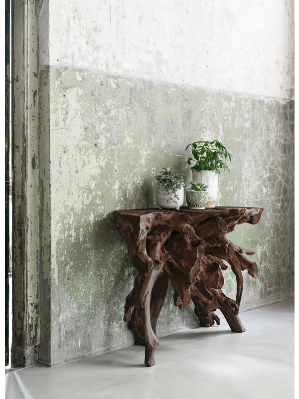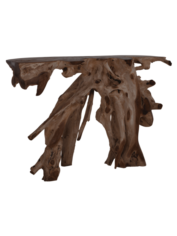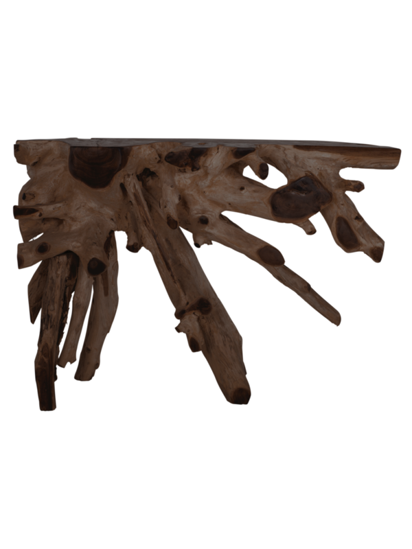 Breng een stukje pure natuur in huis met wandtafel Roots. Deze sidetable, gemaakt van teakhouten wortels, straalt karakter en authenticiteit uit. Dankzij de organische vormen en natuurlijke structuren is iedere tafel uniek. Of je hem nu in de hal, woonkamer of als statement in de eetkamer plaatst, deze tafel trekt gegarandeerd alle aandacht. Combineer met stijlvolle accessoires of laat het hout puur spreken.
